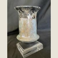 A wonderful large ancient Roman glass beaker stunningly iridescent, with some of its encrustation still showing that would also be pearly if removed. Unusual shape with flared lip and flared base. Displays exceptionally on its on Lucite base.
