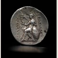 Obv: head of deified Alexander the Great. Rx: of King Lysimachus. Tetra means four; a tetradrachma was worth 4 drachmas. Lysimachus was one of Alexander's generals who took over the kingdom of Thrace in northern Greece when Alexander died. He used the mint of Lampsakos 305-281 BCE to attempt legitimacy, creating coins with his visage.