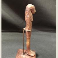 An ancient Egyptian beeswax amulet of one of the four sons of Ra (the Sun God). It is likely to be Amset or Mestha (human head) - "the statue or image". Each son protected one part of the body. Amset was the protector of the stomach and large intestine. The four sons are often shown standing together on a lotus flower before Osiris. These amulets were normally wrapped inside the mummy wrappings and usually in two pairs on the chest or stomach belong the winged scarab. From the sarcophagus of an Ibis. Very rare. On a custom old English collector's wooden stand.
